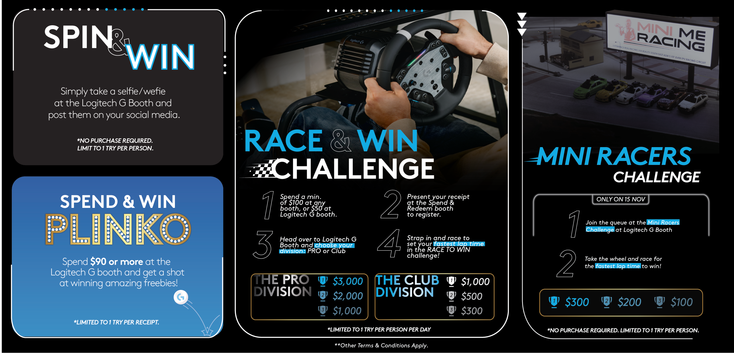 - Participants must spend a minimum of SGD $100 at any booth, or SGD $50 on Logitech products in a single receipt at the Smart Home Tech Show 2025 to receive one (1) chance to compete in the Race & Win Challenge.